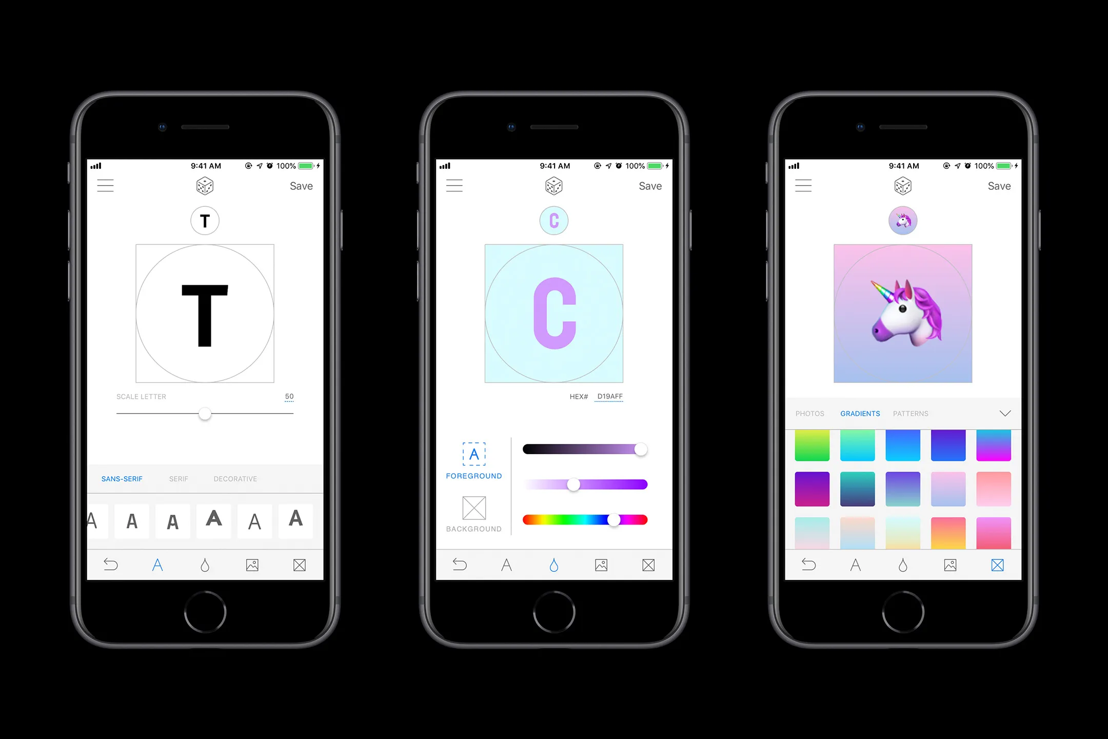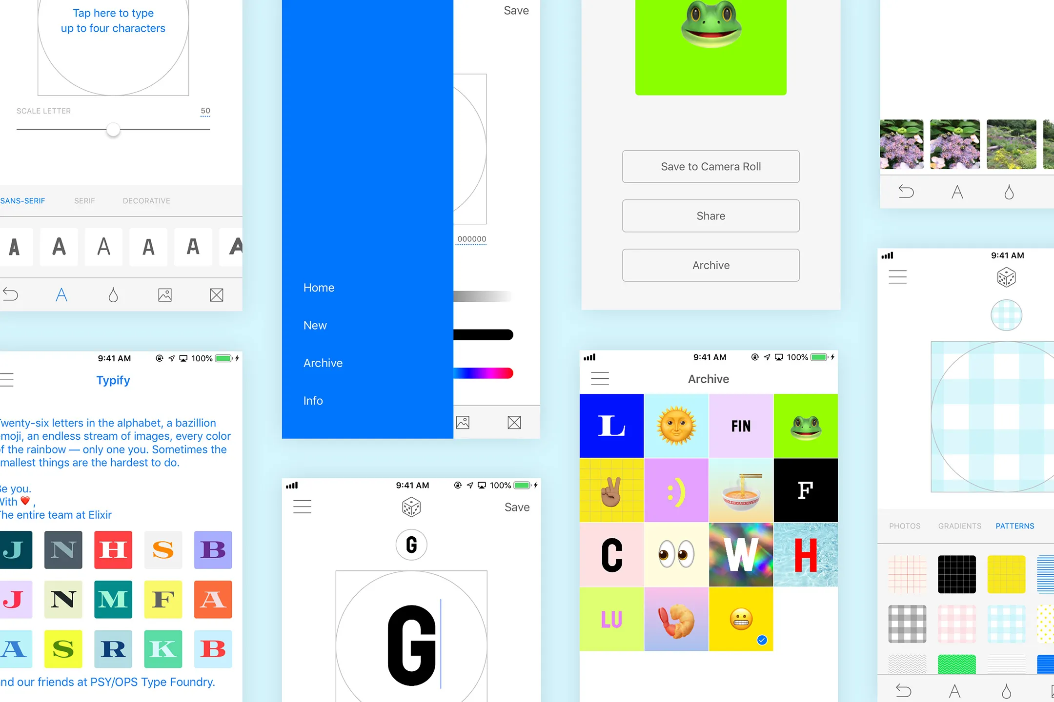 Typify is a mobile app designed and published by Elixir Design in partnership with PSY/OPS Type Foundry. The app allows you to easily create a font-based profile image for your social media accounts, whether you are an individual looking for different ways to express yourself, or a corporate team that wants a cohesive online presence.