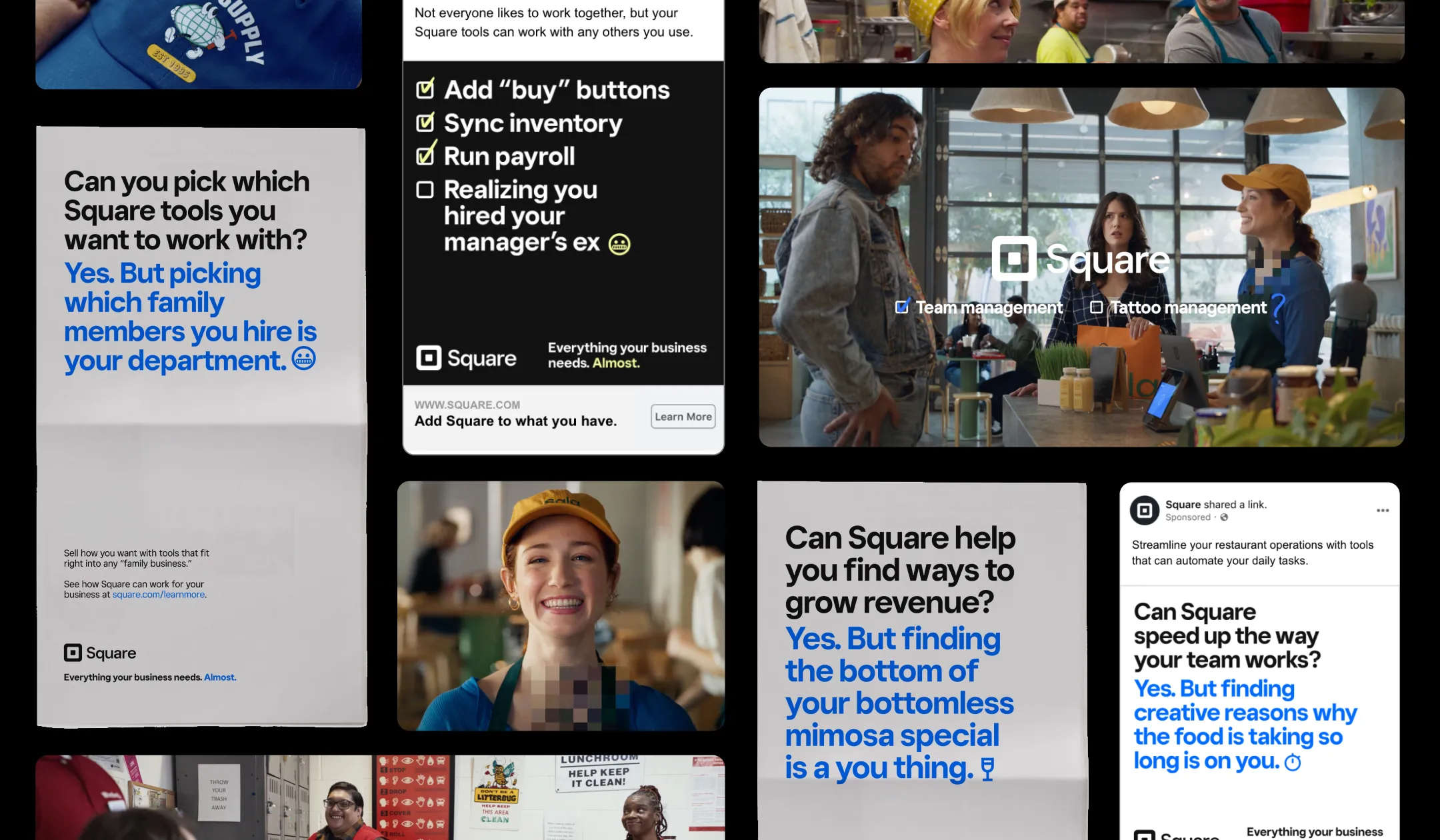 Everything Your Business Needs. Almost. was Square's global platform, running across the UK, Ireland, Australia, and the US. This was its American debut. I led the art direction and design under the creative direction of Sean Conroy, Kae Yen Wong and Said Fayad. Directed by Emmy-nominated Dime Davis, we leaned into workplace-style comedy to connect with upmarket sellers in a way Square never had before.