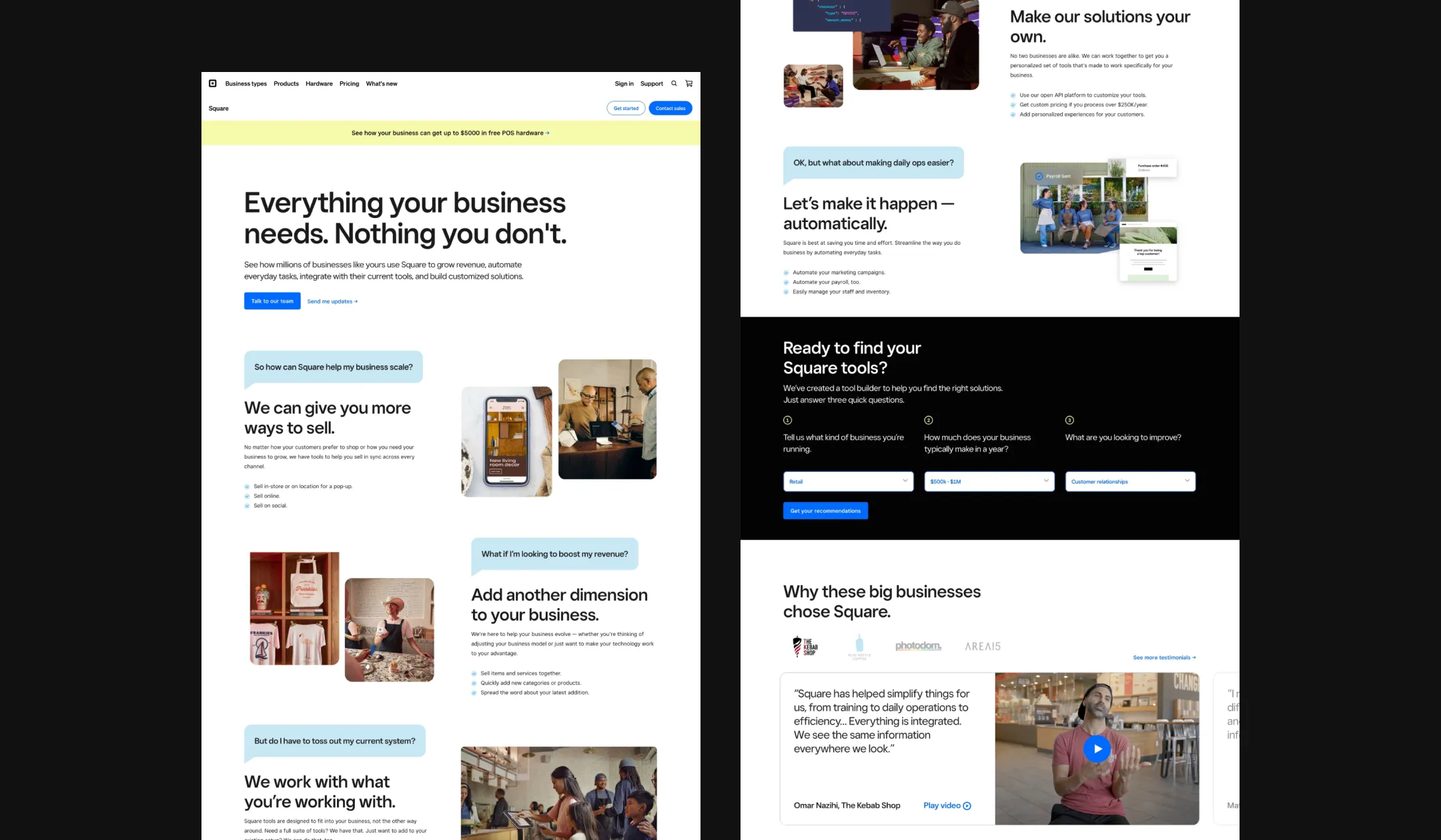 The landing page was designed to feel like a conversation rather than a product catalog. Instead of leading with features, we led with hypothetical questions a business owner might actually ask, drawing them through the page one question at a time. The approach was later adopted by other campaigns at Square.